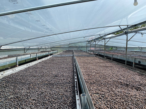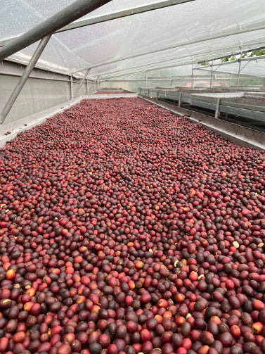 This coffee was harvested at peak ripeness and dried as whole cherry on solar beds inside our solar greenhouse. It was carefully monitored and slow-dried for 26 days to ensure even drying until it reached the optimal moisture content.